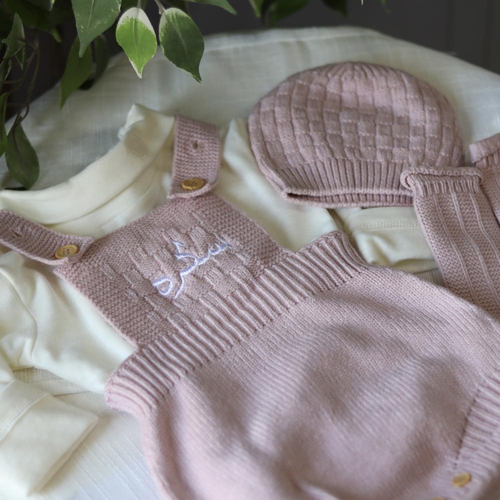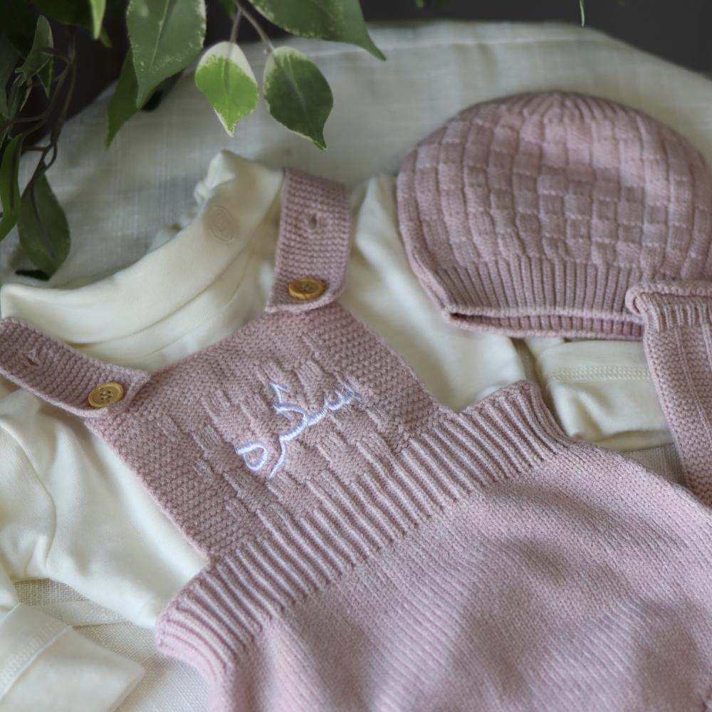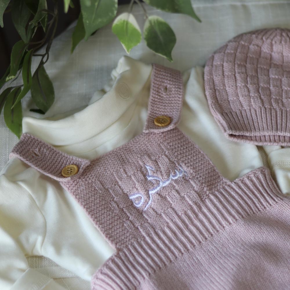 يتميز الطقم بتطريز اسم المولود بخيوط بيضاء بطريقة أنيقة تُضفي لمسة شخصية فاخرة، مع تفاصيل محبوكة بدقة وأزرار خشبية صغيرة تضيف طابعًا كلاسيكيًا جميلًا