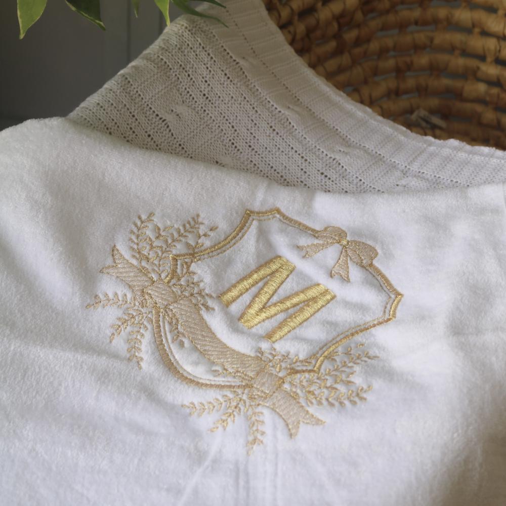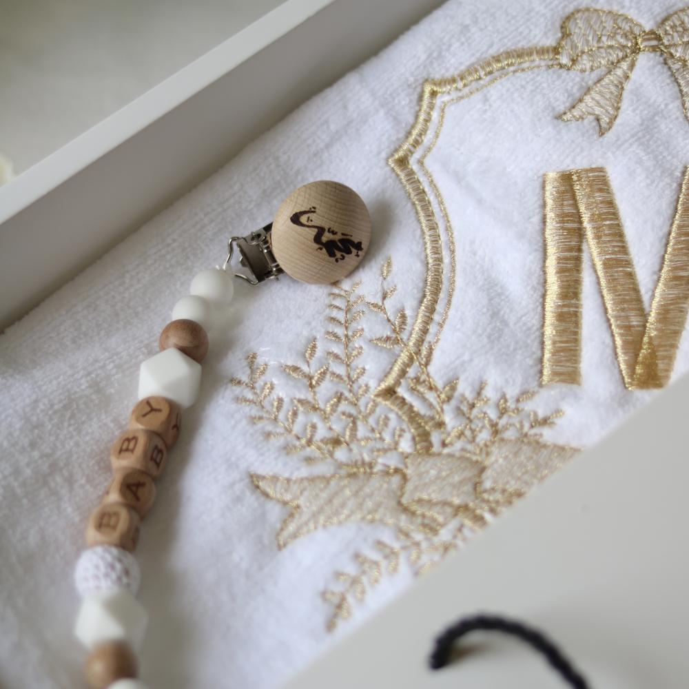 • فوطة استحمام للمولود مطرزة أيضًا باسمه لترافقه في لحظاته الأولى.