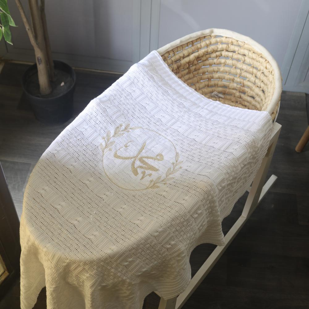• مفرش سرير بخامة الصوف ومطرز باسم المولود لمسةً شخصية دافئة.