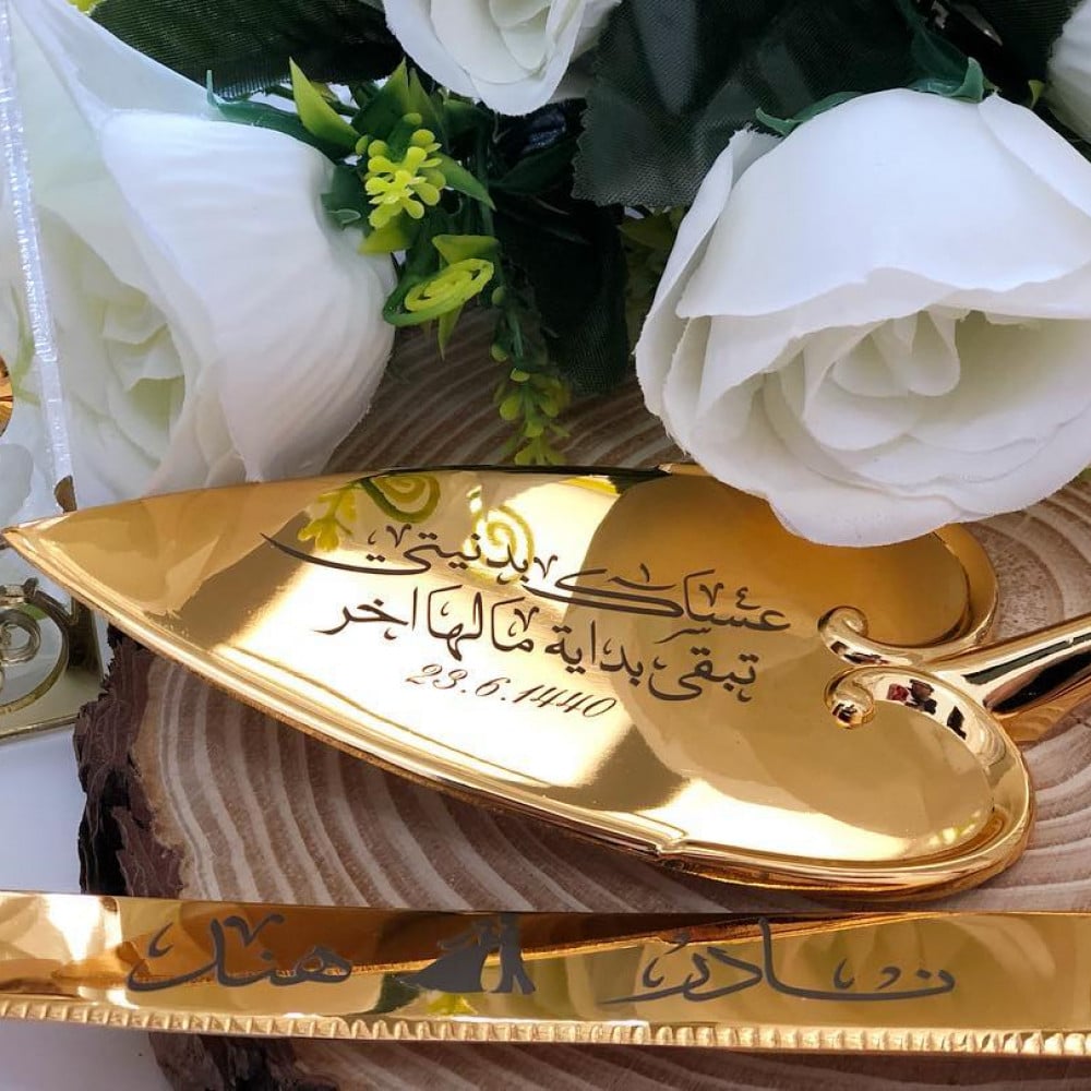.- 2 صحن دائري طباعة . - 2 كوب زجاج .- 2 شوكة ذهبية . - 2 شمعة زجاجية فانيلا بلوقو العريس و العروس . -2 شمعة بالأحرف .