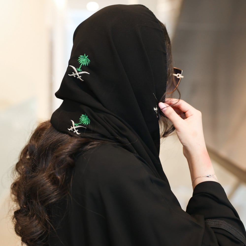 طرحة باللون الاسود مطرز عليها سيفين ونخله